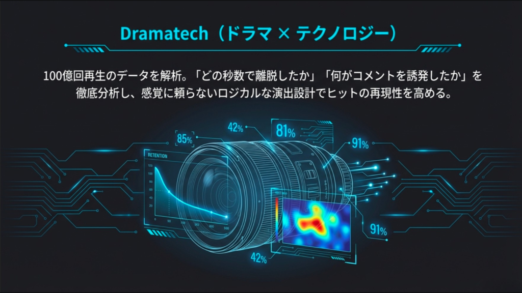 また、株式会社GOKKOはTikTokなどでの累計100億回再生のデータを保有しており、「どの秒数で離脱したか」「どんな展開でコメントが増えたか」を徹底的に分析しています。 WEBTOON原作を映像化する際も、単になぞるのではなく、映像として最も効果的な演出や構成にデータを基にアレンジを加えることで、原作ファンを納得させつつ、新規の視聴者も引き込む「再現性のあるヒット」を生み出しています。
