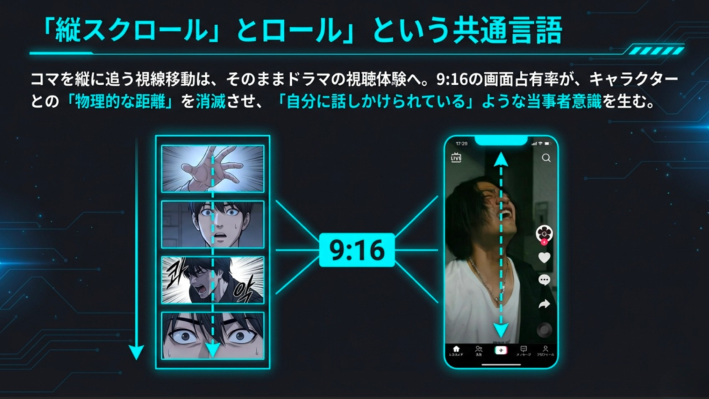株式会社GOKKOの分析によると、現代の視聴者、特にZ世代は「タイパ(タイムパフォーマンス)」を極限まで重視します。彼らは面白いかどうかわからない1時間のドラマを座って見るよりも、移動中や寝る前の数分間で確実に感情が動く体験を求めています。 WEBTOONもショートドラマも、この「隙間時間の占有」という点において競合ではなく、相互補完的な関係にあります。漫画で読んだストーリーが、実写の演技と音声によってよりリアルな「体験」として再構築される。そのスピード感と手軽さが、現代のコンテンツ消費スタイルに合致しているのです。
